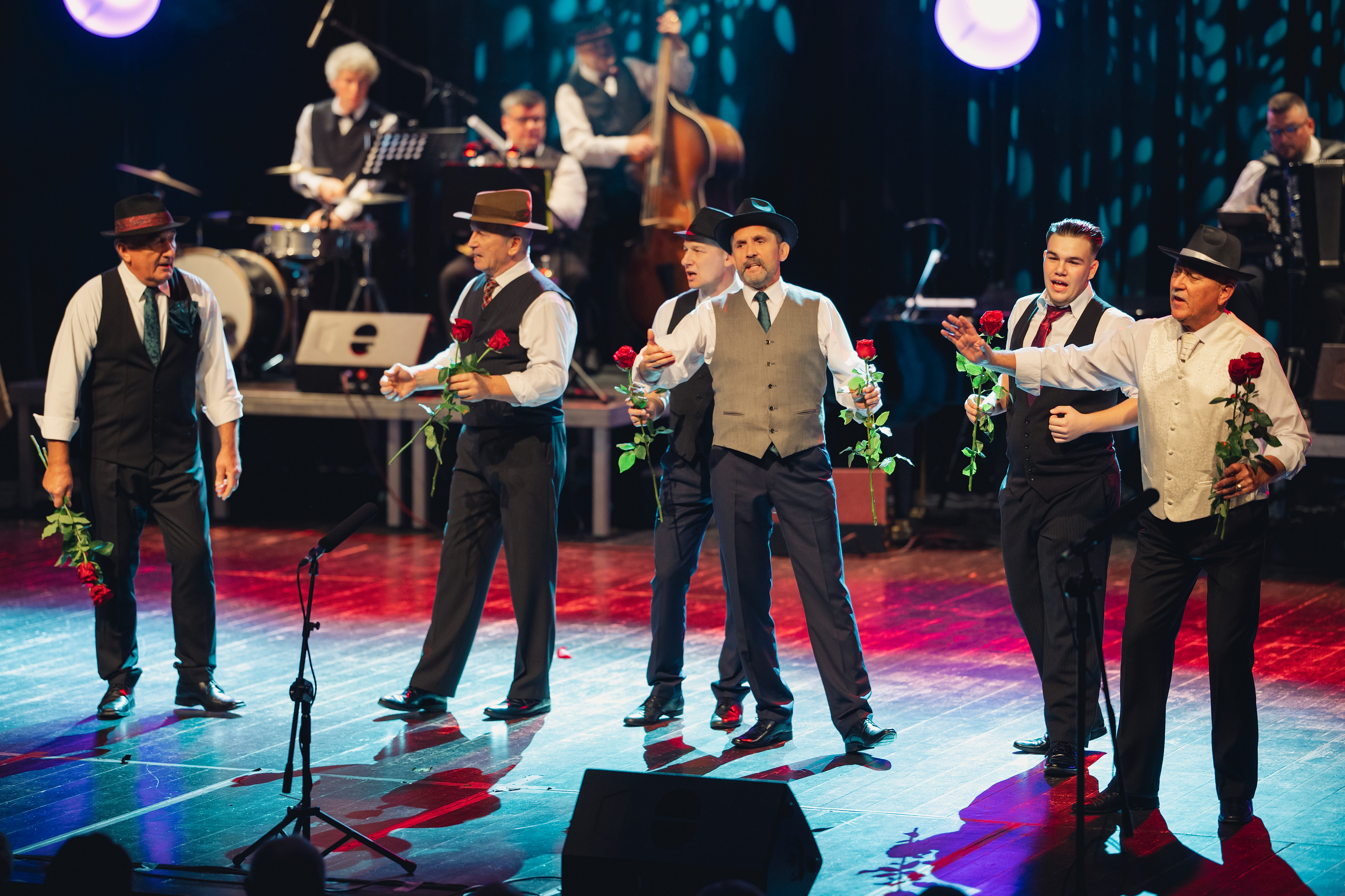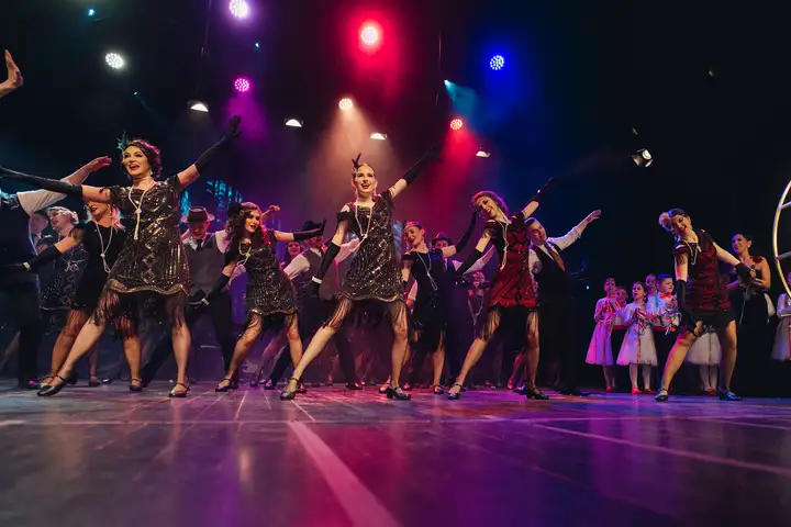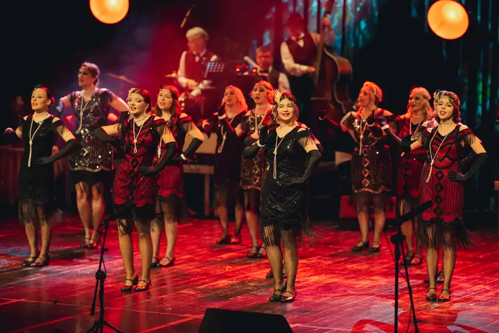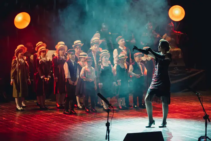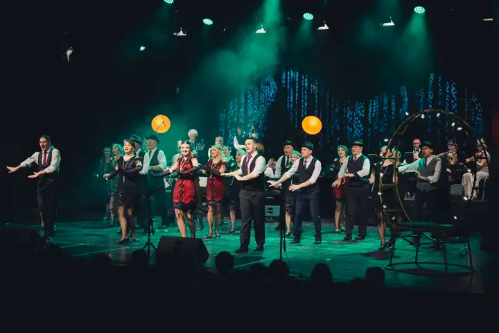 Na scenie występuje około 60 artystów — kapela, tancerze, soliści i chór, a także dzieci i dorośli wykonawcy. To pełnowymiarowe widowisko sceniczne z muzyką na żywo, dopracowanymi choreografiami, kostiumami z epoki i scenografią stylizowaną na kabaretowy lokal z lat międzywojennych.